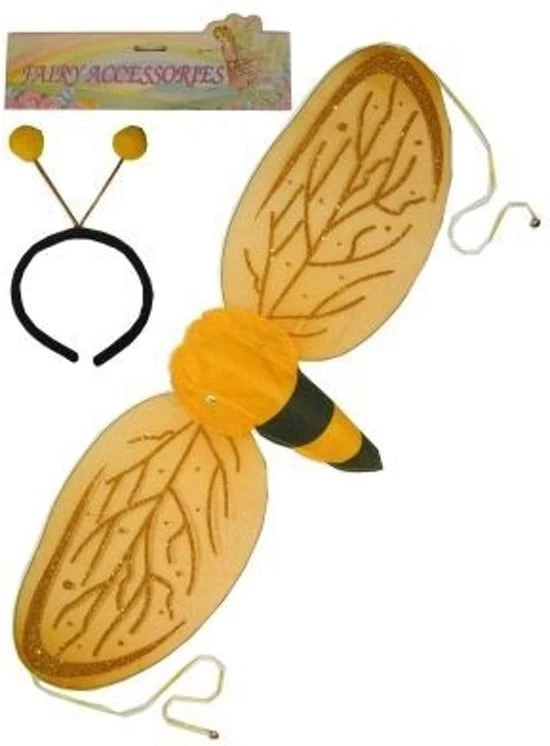 Set bestaat uit vleugels die je op je rug kan doen en een bijtje haarband.