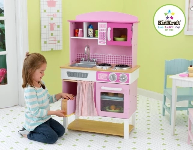 Uw kleine keukenprinsen -prinsessen zullen met stijl koken in onze roze houten keuken! Kenmerken: