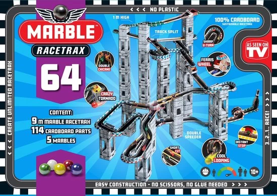 Bouw de ultieme Marble Racetrack knikkerbaan met deze nieuwe set. Eenvoudig te bouwen, de kinderen zullen een ontploffing hebben in het verkennen van fysica en dynamiek, terwijl ze bouwen aan een super-knikkerbaan van plezier. De knikkerbaan van stevig karton wordt 9 meter lang, bevat 64 vellen waarvan 114 kartonnen onderdelen gemaakt worden en 5 knikkers. Geschikt voor kinderen vanaf 10 jaar.