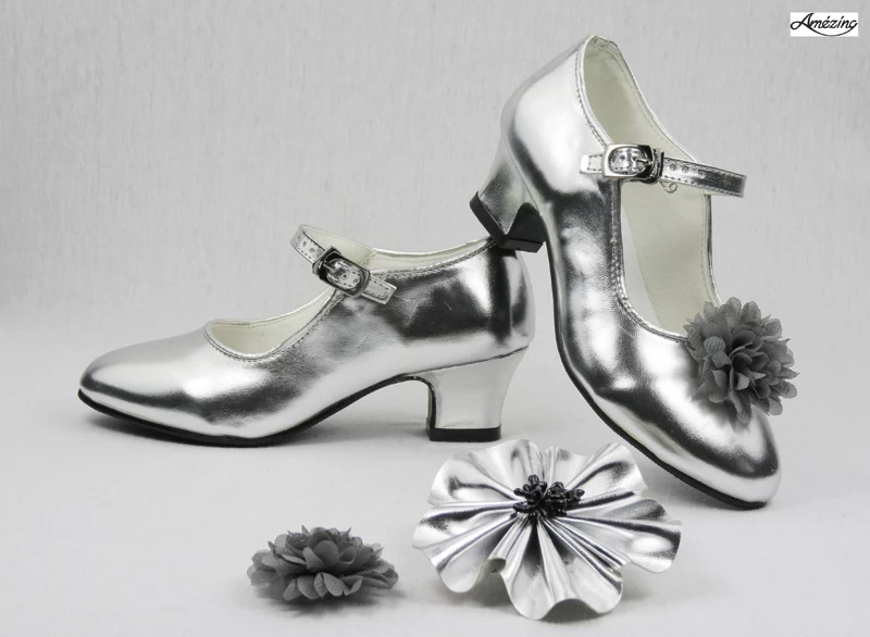 Meisjesschoenen met hakje in zilver met twee bloemclips en een bloem broche haarspeld. De bloem broche haarspeld is gemaakt van hetzelfde materiaal in dezelfde kleur als het schoentje en kan zowel in het haar als gespeld op kleding gedragen worden. De bloemclips kunnen op de neus van de schoen gedragen worden. De bloemclips kunnen, vanwege de clip op de achterzijde van de bloem, heel eenvoudig aan de schoen bevestigd worden.