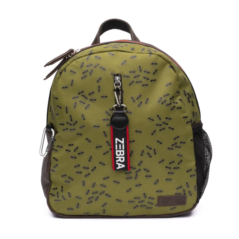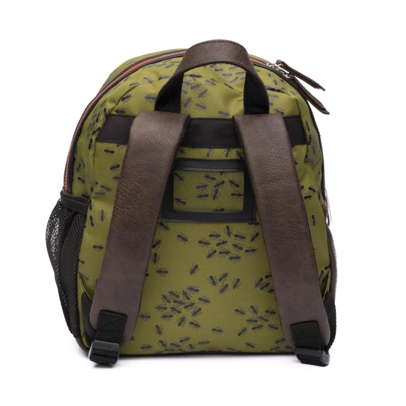 Omdat jongens natuurlijk van stoere insecten houden! Te leuke olijfkleurige canvas rugzak met mieren dus. Voorop zit een verticale rits met sleutelhanger, die dient als extra opbergvak. De gehele tas sluit met een stevige blokrits met dubbele sluiting. Aan de zijkant is de rugzak afgewerkt met bruin imitatieleer. De tas is te dragen dmv het korte hengsel bovenop en de verstelbare schouderbanden. Binnenin bevinden zich 2 drinkbeker vakken en een zwarte voering. Achterop de rugzak zit het handige naamlabel.